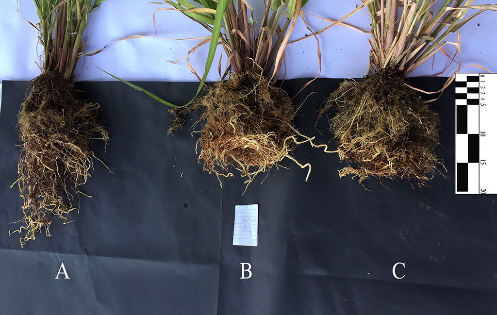 Se observan engrosamientos en los ápices radiculares, y menor desarrollo de raíces secundarias. Se detiene el crecimiento de las raíces, y las plántulas mueren antes de emerger por la limitación en absorción.